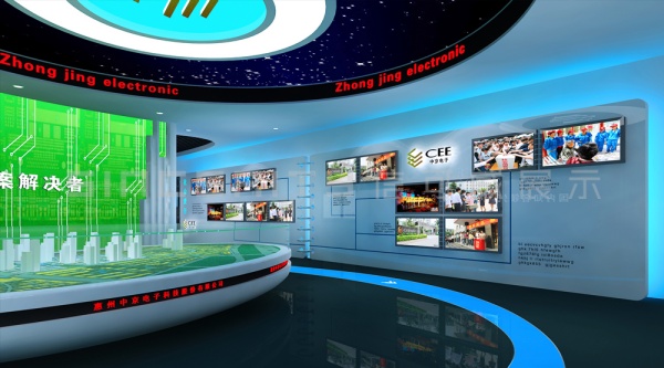 展厅入口以简洁的蓝灰色调为基底,“中京电子科技馆” 几个大字沉稳矗立,浮雕欢迎语明亮又具科技感,内部展厅的蓝绿色调隐隐透出,像在邀请参观者踏入一场科技探险之旅,这里是连接现实与未来科技世界的通道 。