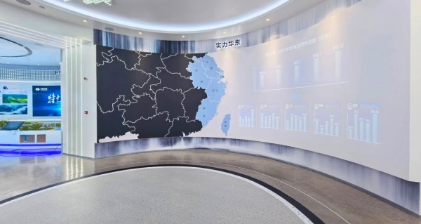 大量运用科技感十足的设计元素,如中央圆柱内的蓝色光影效果,仿佛是数据流动或能量传输的视觉化呈现,极具未来感;墙面的电路板纹理装饰、电子屏幕展示动态科技画面等,都强化了展厅的科技主题,能够给参观者带来强烈的科技氛围体验。